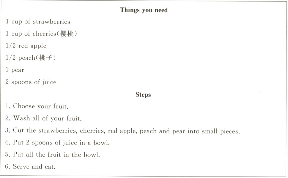 Fruit salad is a delicious dessert(甜点) and you can make it in less than ten minutes. What’s more, you can enjoy it without becoming fatter. Fruit salad can also be a great side dish(配菜) at a party, or a wonderful snack(小吃) during anytime of a day. If you want to know how to make fruit salad, just follow the steps.