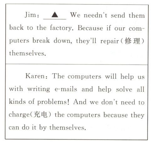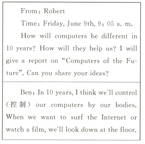 1.A 【解析】根据Robert的第一条消息“I will give a report on ‘Computers of the Future’. Can you share your ideas?”可知,他写这条消息是为了收集大家的想法,以便作报告。 2.A 【解析】Ben提到“we’ll control our computers by our bodies”,即未来可以用身体控制电脑,符合题目描述。 3.B 【解析】Jim的回复应围绕电脑的修理问题,因为后文提到“if our computers break down, they’ll repair themselves”,所以填入“未来电脑更容易修理”最合适。 4.B 【解析】Karen提到电脑会帮助写邮件(b)、解决各种问题(c),并且可以自己充电(d),但没有提到玩游戏(a),所以选B。 5.D 【解析】通读全文可知,讨论的是未来电脑的发展,属于“科技(Science)”主题。
