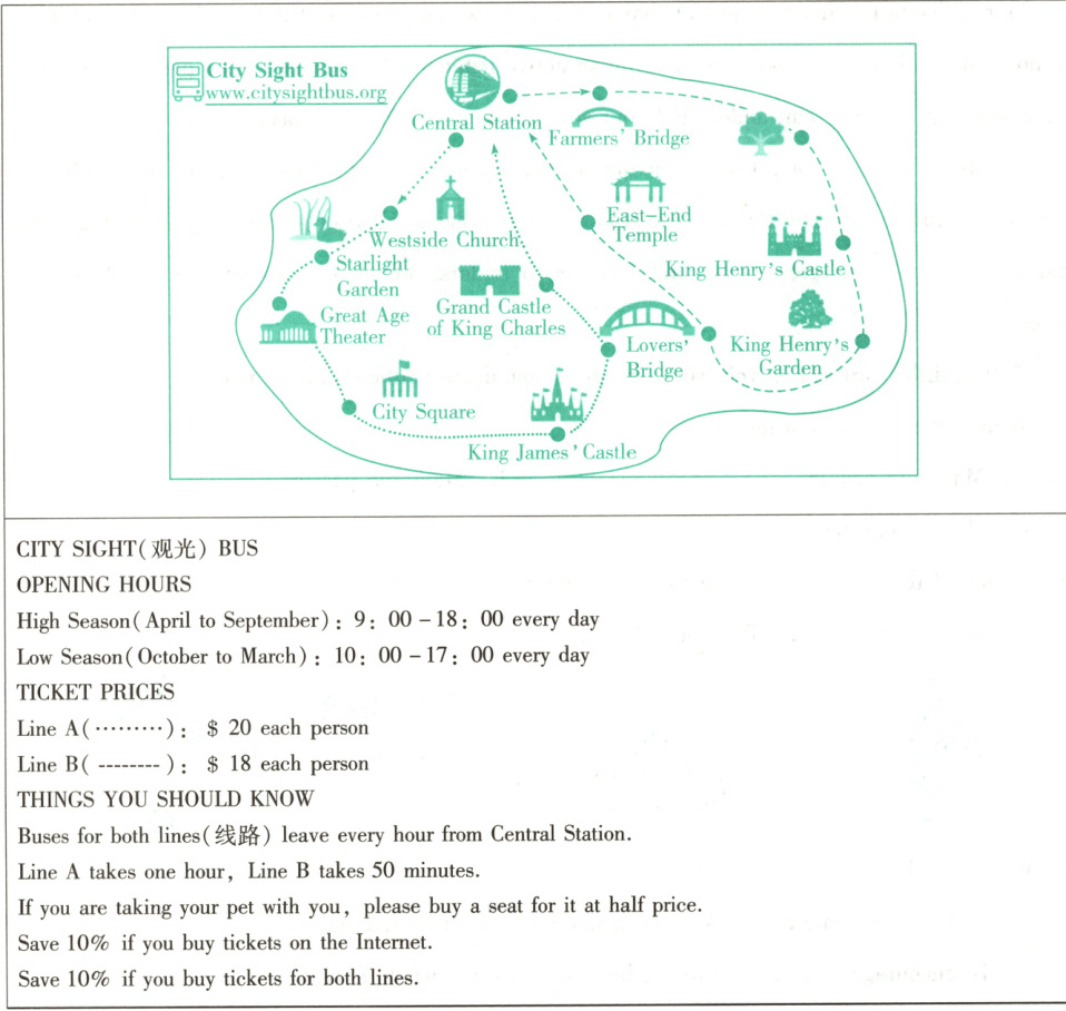 2.细节理解题。根据“Low Season(October to March):10:00-17:00 every day”可知,12月11点可以乘坐城市观光车。故选B。