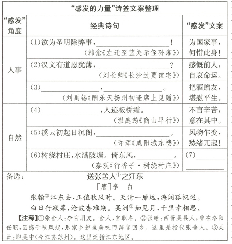 3. 筹备组准备从《送张舍人之江东》中选择一联诗句制作“感发”诗签,你会选择哪一联?请结合诗歌内容,简要阐述理由。(4分)
