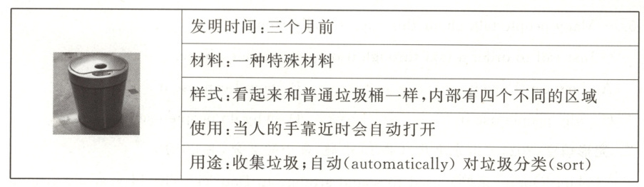 My invention is a smart waste basket made of a special material. It was invented three months ago. It looks the same as common waste baskets, but there are four different areas inside it. It will open when people’s hands get close to it. So it’s really convenient. It can not only be used for collecting rubbish but it can also be used to sort rubbish into different kinds auto-matically. This helps people save time and makes people’s lives more convenient. It’s a useful invention, right?
