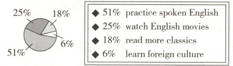 Recently we’ve made a survey of Sky English Club. Here are the results. We find that fifty-one percent of the students want to practice their spoken English by using the Internet. Twenty-five percent like watching English movies,which can make their holiday lives better. Eighteen percent would like to read more English classics because they are interested in them. Six percent hope that they can learn more foreign culture,such as good manners and western festivals.