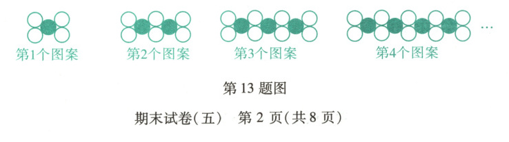 13. (营口盖州期末)如图是一组有规律的图案, 它由若干个大小相同的圆片组成. 第 1 个图案中有 4 个白色圆片, 第 2 个图案中有 6 个白色圆片, 第 3 个图案中有 8 个白色圆片, 第 4 个图案中有 10 个白色圆片, ……依此规律, 第 $n$ 个图案中有