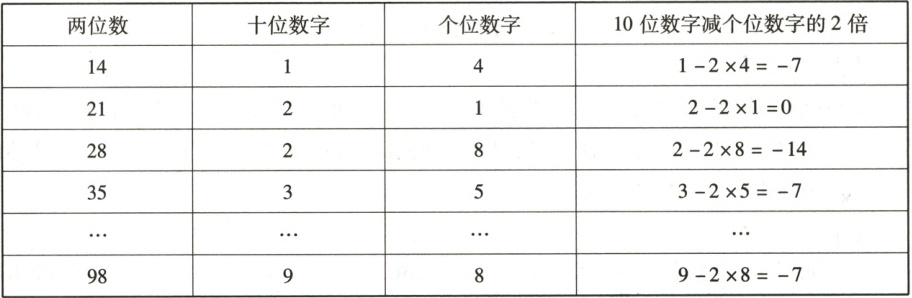 小聪在学习完课本上的数学活动后, 对数的整除很感兴趣, 于是自己研究了被 7 整除的数的特征, 先从两位数开始研究: