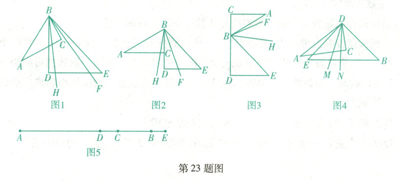 (1)①“智慧小组”的同学决定从特例入手探究老师提出的问题, 他们将三角尺分别按图 2、图 3 所示的方式摆放, $BH$ 和 $BF$ 仍然是 $\angle ABE$, $\angle CBE$ 的平分线, $DB$ 和 $BC$ 在同一直线上. 分别计算出图 2, 图 3 中 $\angle HBF$ 的度数, 发现 $\angle HBF$ 的度数均为