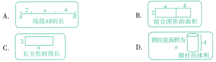 C [解析]A.线段AB的长为$2 + a + 4 = 6 + a$,不符合题意;B.组合图形的面积为$2 × (a + 4) = 2a + 8$,不符合题意;C.长方形的周长为$2(a + 2) = 2a + 4$,符合题意;D.圆柱的体积为$4a$,不符合题意.
