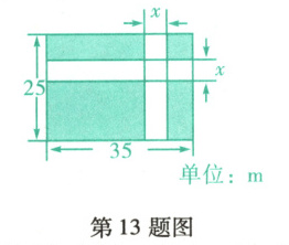 13. (抚顺清原期末)某公园准备修建一块长方形草坪,长为35m,宽为25m,并在草坪上修建如图所示的十字路,已知十字路宽$x$m,则修建的十字路的面积是