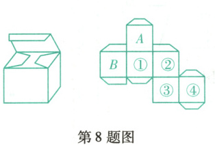 8. (大连甘井子期末)如图是一个粉笔盒的表面展开图.若字母$A$表示粉笔盒的上盖,$B$表示侧面,则底面在表面展开图中的位置是(