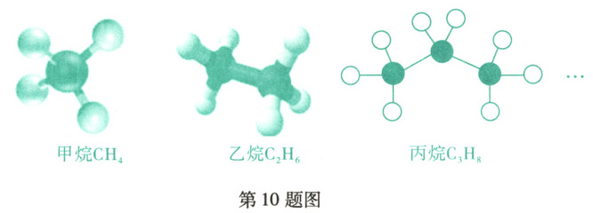 10.A 【解析】设碳原子的数目为n(n为正整数)时,氢原子的数目为$a_n$,观察发现规律:$a_1=4=2×1+2$,$a_2=6=2×2+2$,$a_3=8=2×3+2$,…,$a_n=2n+2$,