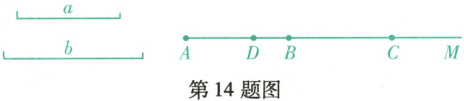 14. (大连沙河口期末)如图,已知线段$a$,$b$,求作一条线段,使它等于$2a - b$.作法:①画射线$AM$;②在射线$AM$上顺次截取$AB = a$,$BC = a$;③在线段$AC$上截取$CD = b$.那么所求作的线段是线段
