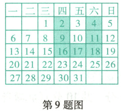 9. (铁岭期末)如图,表中给出的是某月的日历,任意选取"U"型框中的7个数(阴影部分所示),请你运用所学的数学知识来研究,发现此月这7个数的和可能的是(