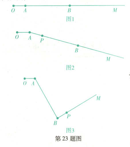如图1,射线$OM$上有$A$,$B$两点,$OA = 12$,$OB = 5OA$.一动点$P$从点$A$出发,以每秒4个单位长度的速度沿射线$AM$的方向运动,同时,射线$AM$开始绕点$A$按顺时针方向以每秒$5^{\circ}$的速度旋转(如图2),当点$P$到达点$B$时,射线$AM$旋转停止;接着,射线$BM$开始绕点$B$按逆时针方向以每秒$15^{\circ}$的速度旋转,同时点$P$降速一半沿射线$BM$的方向运动(如图3).设点$P$的运动时间为$t$秒$(t > 0)$.