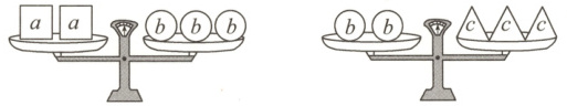 6. 如图所示,天平中的物体$a,b,c$使天平处于平衡状态,则物体$a$与物体$c$的重量关系是(