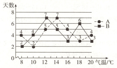 16. 如图所示的折线统计图分别表示A县和B县在4月份的日平均气温的情况,记该月A县和B县日平均气温是12℃的天数分别为a天和b天,则a + b =.