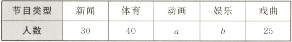 21. (6分)为了解某地区七年级学生对新闻、体育、动画、娱乐、戏曲五类电视节目的喜爱情况,从该地区随机抽取部分七年级学生作为样本,采用问卷调查的方法收集数据(参与问卷调查的每名同学只能选择其中一类节目),并把调查得到的数据用下面的表和扇形统计图来表示(表、图都没有制作完成).