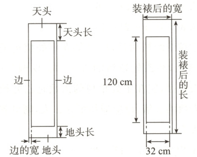 8. 对联是我国传统文化的瑰宝,对联装裱后,如图所示,上、下空白处分别称为天头和地头,左、右空白处统称为边.一般情况下,天头长与地头长的比是$6:4$,左、右边的宽相等,且均为天头长与地头长的和的$\frac{1}{10}$.某人要装裱一副对联,对联的长为$120\mathrm{c}\mathrm{m}$,宽为$32\mathrm{c}\mathrm{m}$,若要求装裱后的长是装裱后的宽的$4$倍,求边的宽和天头长.