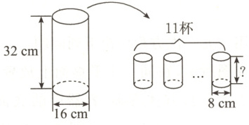 7. 好朋友给小亮过生日,如图所示,现有底面直径为$16\mathrm{c}\mathrm{m}$,高为$32\mathrm{c}\mathrm{m}$的圆柱形容器,里面装满了果汁,小亮要把果汁分装到底面直径为$8\mathrm{c}\mathrm{m}$的$11$个小圆柱形杯子里,与好友分享,结果第$11$个杯子没有装满,只装了$8\mathrm{c}\mathrm{m}$高.请你帮他计算杯子的高度.