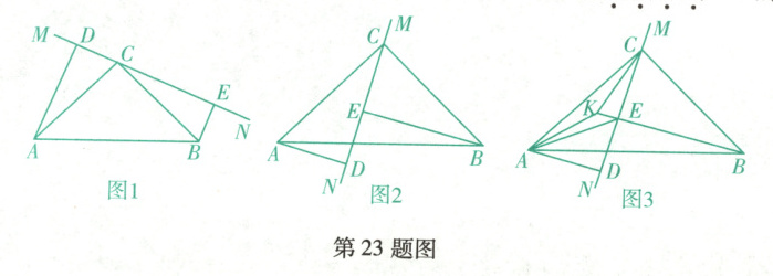 (2)如图2,当$A,B$两点在直线$MN$的两侧时,探究线段$AD,BE$和$DE$的数量关系,并说明理由.