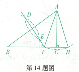 14.6 【解析】由基本作图方法得出$DE$垂直平分$AB$,则$AF = BF$,$AF = AH$,$AC \perp FH$,$\therefore FC = CH$,$\because AF + FC = BF + FC = AH + CH = BC = 3$,$\therefore \triangle AFH$的周长为$AF + FC + CH + AH = 2BC = 6$.