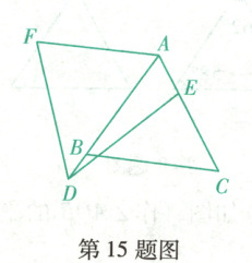 15. (大连高新期末)如图,$\triangle A B C$是等边三角形,边长为8,点$D$在$A B$的延长线上,且$B D=2$,动点$E$从点$A$出发,沿射线$A C$运动,连接$D E$,将线段$D E$绕点$D$按逆时针方向旋转$60^{\circ}$得到线段$D F$,连接$A F$.当$C E=\frac{1}{2} A C$时,则线段$A F$的长为