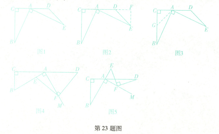 (3)如图5,在$Rt\triangle ABC$中,$\angle C=90^{\circ}$,延长$CA$至点$D$,使$AD=AB$,射线$AM\perp AB$,点$E$在线段$BA$的延长线上,点$F$在射线$AM$上,连接$EF$,$DF$,$EF=DF$且$EF\perp DF$.若$BC=7$,$AE=2$,请直接