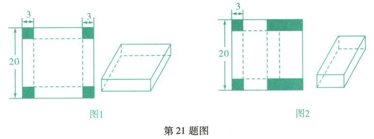 (2)综合实践小组利用边长为20cm的正方形纸板,按以上两种方式制作长方体形盒子.如图1,先在纸板四角剪去四个同样大小且边长为3cm的小正方形,再沿虚线折合起来,可制作一个无盖长方体形盒子.如图2,先在纸板四角剪去两个同样大小边长为3cm的小正方形和两个同样大小的小长方形,再沿虚线折合起来,可制作一个有盖的长方体形盒子.则制作成的有盖盒子的体积是无盖盒子体积的