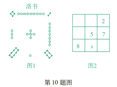 10. (沈阳于洪期末)把$1\sim9$这9个数填入$3×3$方格中,使其任意一行、任意一列及两条对角线上的数之和都相等,这样便构成了一个“九宫格”,它源于我国古代的“洛书”(图1),是世界上最早的“幻方”.图2是仅可以看到部分数值的“九宫格”,则其中$x$的值为(