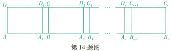 14. (丹东期末)如图,长方形$ABCD$中,$AB=5$,第1次将长方形$ABCD$沿$AB$的方向向右平移4个单位长度,得到长方形$A_{1}B_{1}C_{1}D_{1}$,第2次将长方形$A_{1}B_{1}C_{1}D_{1}$沿$A_{1}B_{1}$的方向向右平移4个单位长度,得到长方形$A_{2}B_{2}C_{2}D_{2}$,…,第$n$次将长方形$A_{n-1}B_{n-1}C_{n-1}D_{n-1}$沿$A_{n-1}B_{n-1}$的方向向右平移4个单位长度,得到长方形$A_{n}B_{n}C_{n}D_{n}(n>2)$. 若$AB_{n}$的长度为2025,则$n$的值为
