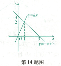 14. (沈阳沈河期末)在平面直角坐标系 $x O y$ 中, 一次函数 $y=k x$ 和 $y=-x+3$ 的图象如图所示, 则二元一次方程组 $\left\{\begin{array}{l}k x=y, \\ -x+3=y\end{array}\right.$ 的解为 ______ .