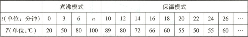 (2)在煮沸模式下,设$T$关于$t$的函数表达式为$T = kt + b$,把$t = 0$,$T = 20$和$t = 3$,$T = 50$代入表达式,得$\begin{cases} b = 20, \\ 3k + b = 50, \end{cases}$解得$\begin{cases} k = 10, \\ b = 20, \end{cases}$