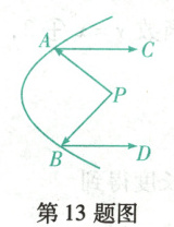 13. (丹东期末) 如图是某灯具的镜面反射示意图,从光源点$P$处发出的光线$PA$,$PB$经弯曲的镜面反射后射出,且满足反射光线$AC// BD$.若$\angle PAC=40^{\circ}$,$PA\perp PB$于点$P$,则$\angle PBD$的度数为