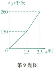 9.(沈阳法库期末)“五一”期间,乐乐老师一家自驾游去了离家 260 千米的某目的地,如图是她们离家的距离$y$(单位:千米)与汽车行驶时间$x$(单位:时)之间的函数图象,他们出发 2.3 小时时,离目的地还有(