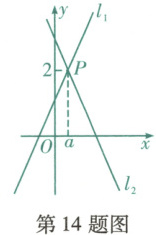 14.(沈阳法库期末)如图,一次函数$y = kx + b$的图象$l_{1}$与一次函数$y = -x + 3$的图象$l_{2}$相交于点$P$,则方程组$\begin{cases}y = kx + b,\\y = -x + 3\end{cases}$的解为 ________ .