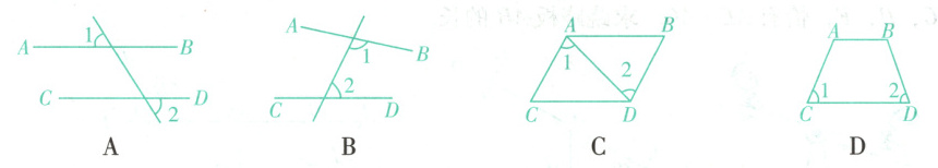 4. (沈阳辽中期末)在下列图形中,由 $\angle 1=\angle 2$ 能判定 $A B / / C D$ 的是(