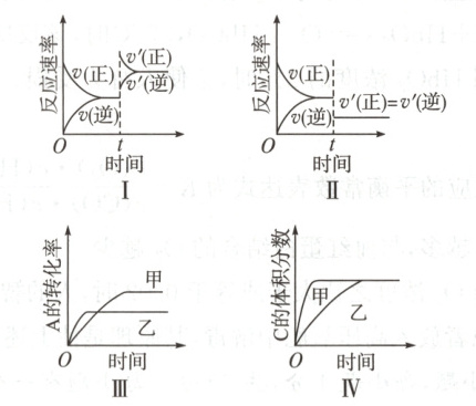 7.A 解析 该可逆反应的正反应是放热反应,且反应前后气体体积不变,图Ⅰ表示反应速率与时间的关系,增大反应物浓度,正反应速率突增,而逆反应速率瞬时不变,即逆反应速率应在原平衡基础上渐增,A项错误;图Ⅱ,减小压强,平衡不移动,但是正、逆反应速率同等程度减小(仍然相等),B项正确;图Ⅲ中乙先达到平衡,根据“先拐先平温度高”可知,乙的温度高于甲的温度,乙→甲,降低温度,平衡正向移动,A的转化率增大,C项正确;图Ⅳ中,甲先达到平衡,说明甲中催化剂的催化效率较高,D项正确。