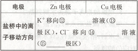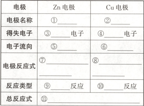 (2)①负极②正极 ③失 ④得 ⑤流出 ⑥流入 ⑦Zn-2e⁻=Zn²⁺ ⑧Cu²⁺+2e⁻=Cu ⑨氧化⑩还原 ⑪Zn+Cu²⁺=Zn²⁺+Cu ⑫CuSO₄ ⑬正 ⑭ZnSO₄ ⑮负