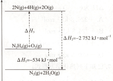 B 解析 根据图示可知,断裂$1\ mol\ H_2N—NH_2$和$1\ mol\ O_2$中的化学键需要吸收的能量为$2752\ kJ-534\ kJ=2218\ kJ$。$1$个$H_2N—NH_2$分子中含有$1$个$N—N$和$4$个$N—H$,设断裂$1\ mol\ N—H$需要吸收的能量为$x$,则$154\ kJ+4x+498\ kJ=2218\ kJ$,解得$x=391.5\ kJ$。
