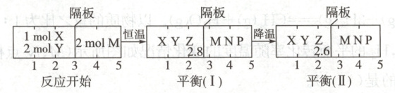 左、右两个反应室内气体压强相等,体积之比等于物质的量之比,$\frac{1-x+2-2x+2x}{2}=\frac{2.8}{2.2}$,可得$x=\frac{5}{11}$,C项正确;由于温度改变时,化学平衡一定发生移动,则降温后,平衡(Ⅱ)与平衡(Ⅰ)中M的体积分数一定不同,D项错误。
