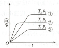【例题2】已知某可逆反应$mA(g) + nB(g) \rightleftharpoons pC(g)$在密闭容器中进行,如图表示在不同反应时间$t$时,温度$T$和压强$p$与反应物B在混合气体中的体积分数$[\varphi(B)]$的关系曲线,由曲线分析,下列判断正确的是(