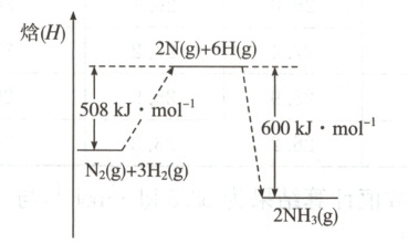 (2)由题图可以看出反应物和生成物的能量差值为 $600\ \mathrm{kJ}-508\ \mathrm{kJ}=92\ \mathrm{kJ}$,该反应的热化学方程式为 $\mathrm{N_2(g)+3H_2(g)\rightleftharpoons 2NH_3(g)}$ $\Delta H=-92\ \mathrm{kJ· mol^{-1}}$。