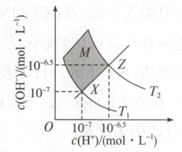 BD 解析: 任何水溶液中都有$K_w=c(H^+)· c(OH^-)$,因此两条曲线间任一点均有此关系,A项正确;$XZ$线上任意点溶液呈中性,M区域在$XZ$上方,均有$c(H^+)<c(OH^-)$,B项错误;$T_1$时$K_w$小于$T_2$时$K_w$,则$T_1<T_2$,C项正确;$XZ$线上任意点溶液呈中性,但只有在$25° C$时pH=7,D项错误。