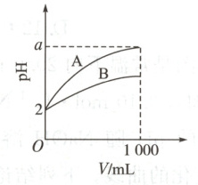 C 解析 由图像可知,稀释过程中两种酸的pH增大程度不同,说明两种酸的强弱不同,故pH=2的两种酸的浓度一定不同,A项错误;稀释后A溶液的pH大于B溶液的pH,则A酸溶液中c(H⁺)小于B酸溶液中c(H⁺),A酸溶液的酸性比B酸溶液的酸性弱,B项错误;a=5时,pH=2的A酸溶液由1 mL稀释至1000 mL,pH增加3,故A酸一定是强酸,pH=2的B酸溶液由1 mL稀释至1000 mL后,pH<5,说明B酸溶液中存在电离平衡,则B酸是弱酸,C项正确;若A、B酸都是弱酸,由1 mL稀释至1000 mL后,A、B两酸溶液pH均要增大,而增加的值均小于3,有2<a<5,若A酸是强酸,则a=5,D项错误。