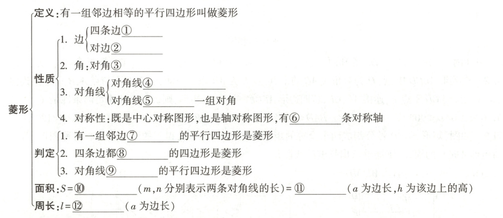 ①相等 ②平行且相等 ③相等 ④互相垂直平分 ⑤平分 ⑥2 ⑦相等 ⑧相等 ⑨互相垂直 ⑩$\frac{1}{2}mn$ ⑪$ah$ ⑫$4a$