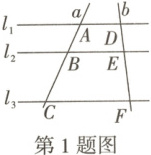 1. 如图,直线$l_{1}// l_{2}// l_{3}$,直线$a$被$l_{1}$,$l_{2}$,$l_{3}$所截得线段$AB$,$BC$,直线$b$被$l_{1}$,$l_{2}$,$l_{3}$所截得线段$DE$,$EF$,则下列等式错误的是(
