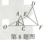8. 如图,已知$\triangle ABC$与$\triangle DEF$是位似图形,经过对应点$B$与$E$,$C$与$F$的两直线交于点$O$,若点$C$是$OF$的中点,则下列判断错误的是(
