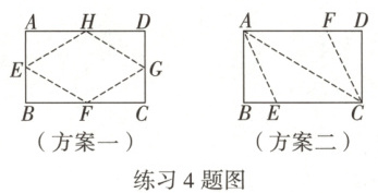 练习 4 一次数学课上,老师让大家在一张长 12 cm、宽 5 cm 的矩形纸片内折出一个菱形. 甲同学按照取两组对边中点的方法折出菱形 $ EFGH $(见方案一),乙同学沿矩形的对角线 $ AC $ 折出 $ ∠CAE = ∠DAC $,$ ∠ACF = ∠ACB $ 的方法得到菱形 $ AECF $(见方案二),请你通过计算,比较这两种折法中,菱形面积较大的是 (
