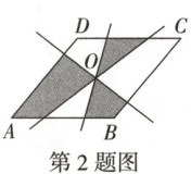 2. 如图,四边形 $ABCD$ 是菱形,$O$ 是两条对角线的交点,过点 $O$ 的三条直线将菱形分成阴影和空白部分。当菱形的两条对角线的长分别为 $6$ 和 $8$ 时,阴影部分的面积为(