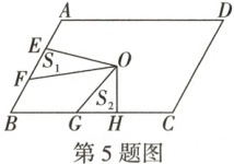 5. 如图,点 $O$ 是平行四边形 $ABCD$ 的对称中心,$AD > AB$,$E$,$F$ 是 $AB$ 边的三等分点;$G$,$H$ 是 $BC$ 边上的点且 $BC = 4GH$。若 $S_1$,$S_2$ 分别表示 $\triangle EOF$ 和 $\triangle GOH$ 的面积,则下列关系式正确的是(