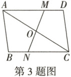 3. 如图,已知 $\triangle ABC$ 与 $\triangle CDA$ 关于点 $O$ 对称,过点 $O$ 任作直线分别交 $AD$,$BC$ 于点 $M$,$N$,下列结论:①点 $M$ 和点 $N$;点 $B$ 和点 $D$ 是关于点 $O$ 的对称点;②直线 $BD$ 必经过点 $O$;③四边形 $ABCD$ 是中心对称图形;④四边形 $DMOC$ 和四边形 $BNOA$ 的面积相等;⑤ $\triangle AOM$ 和 $\triangle CON$ 成中心对称。其中,正确的有(