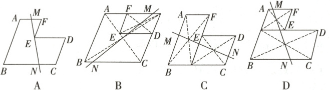 4. 如图,$AB // CD // EF$,$AF // ED // BC$,若画一条直线 $MN$ 将这个图形分成面积相等的两个部分,则下列画法不一定正确的是(